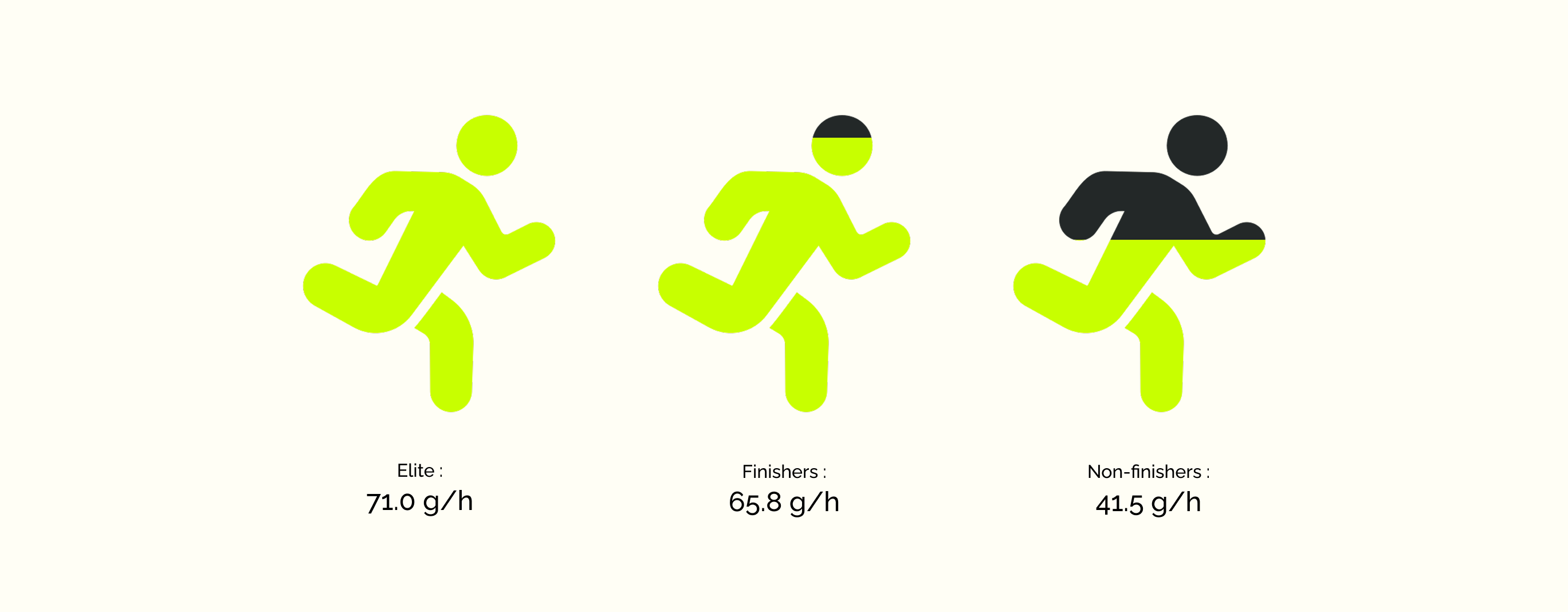 Illustration de la variation de l'apport moyen en glucides en glucides entre athlètes élites (71.0 g /h), athlètes finishers (65,8 g/h) et athlètes non-finishers (41,5 g/h) lors d’ultramarathons de 80 km ou plus.