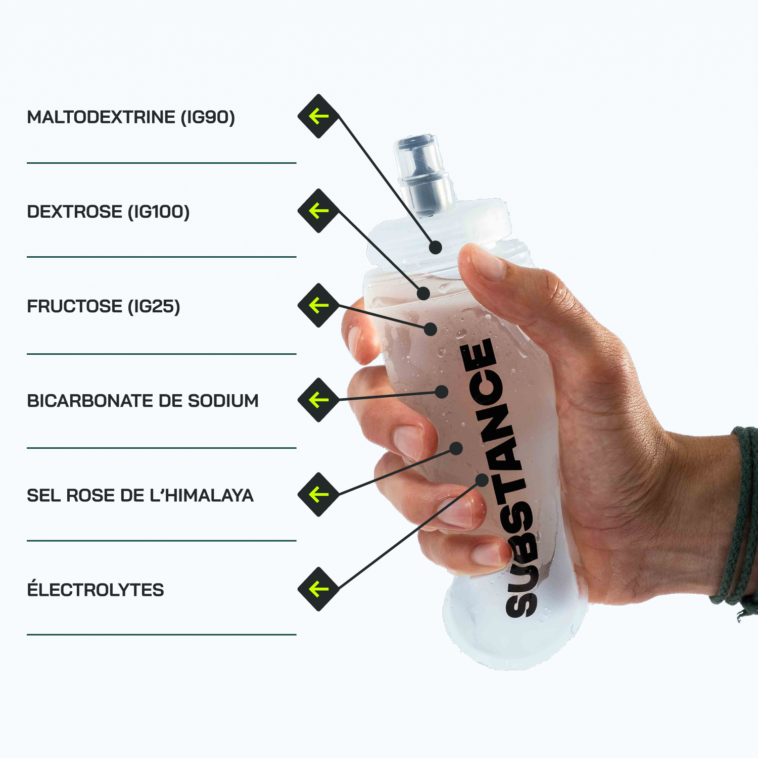 Un mélange de quatre électrolytes clés pour compenser les pertes par transpiration tout au long de l'effort.